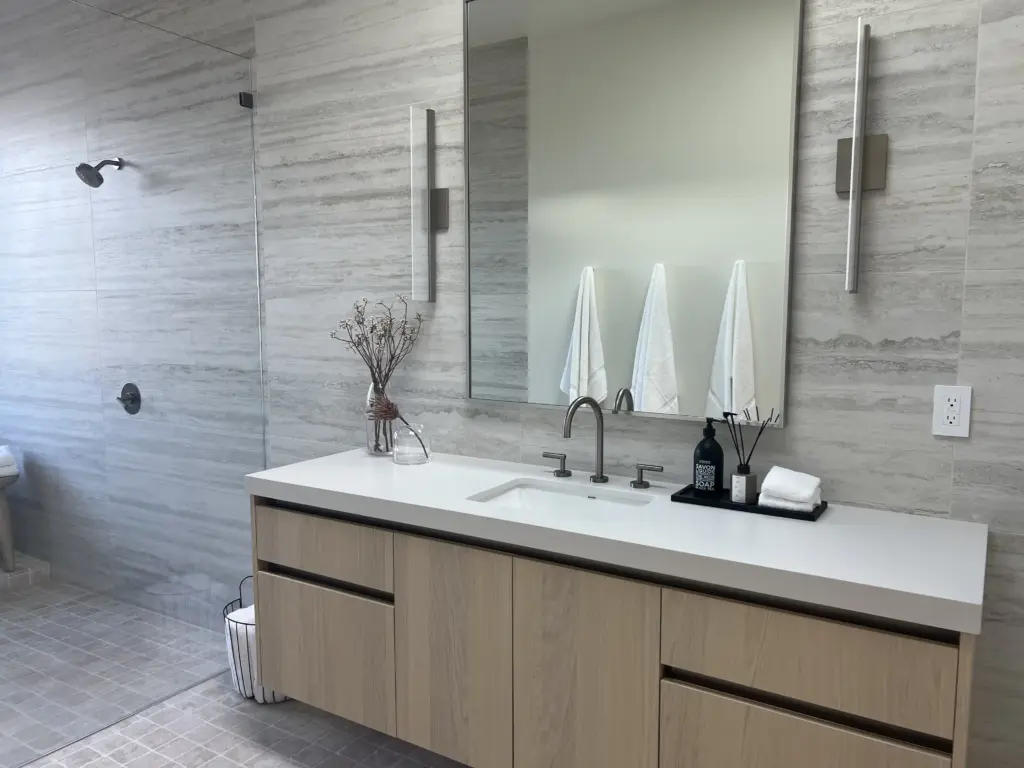 - Polish mirror, wipe faucets, and clean all hardware